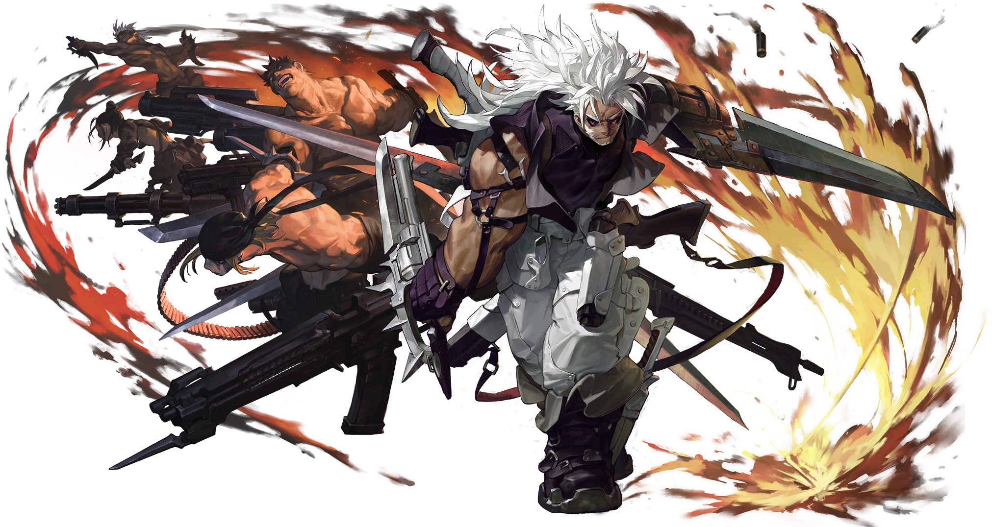 A powerful set of weapons that combines a broadsword, a revolver, and a fist blade. The broadsword delivers heavy slashes that can fell even the mightiest of foes; the revolver and fist blade are integrated into one to provide flexibility in battle by granting the user both a secondary melee weapon and a powerful projectile launcher.